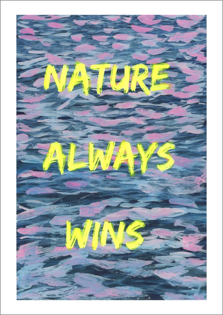 Om dit heugelijke feit te vieren heb ik een speciale actie. In een oplage van 20 breng ik het werk: NATURE ALWAYS WINS, uit. Dit is een fotoafdruk van een beschilderde foto die ik vorig jaar tijdens mijn zeereis van Spitsbergen naar Harlingen heb gemaakt. De tekst zal ik beschilderen zodat het een uniek werk wordt. De opbrengsten gebruik ik voor het verwezenlijken van nieuw werk wat te zien zal zijn tijdens Art Cologne. Voor de mooie prijs van 75 euro kan je het werk kopen.