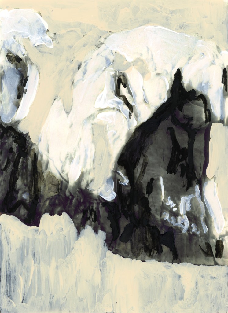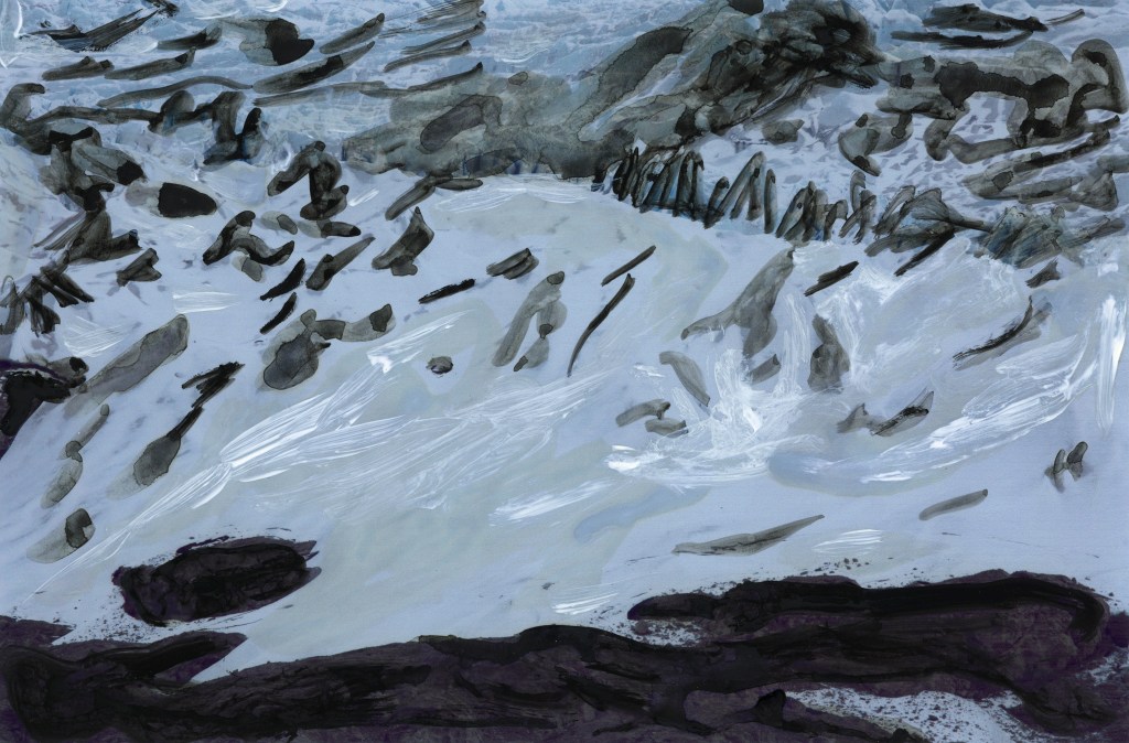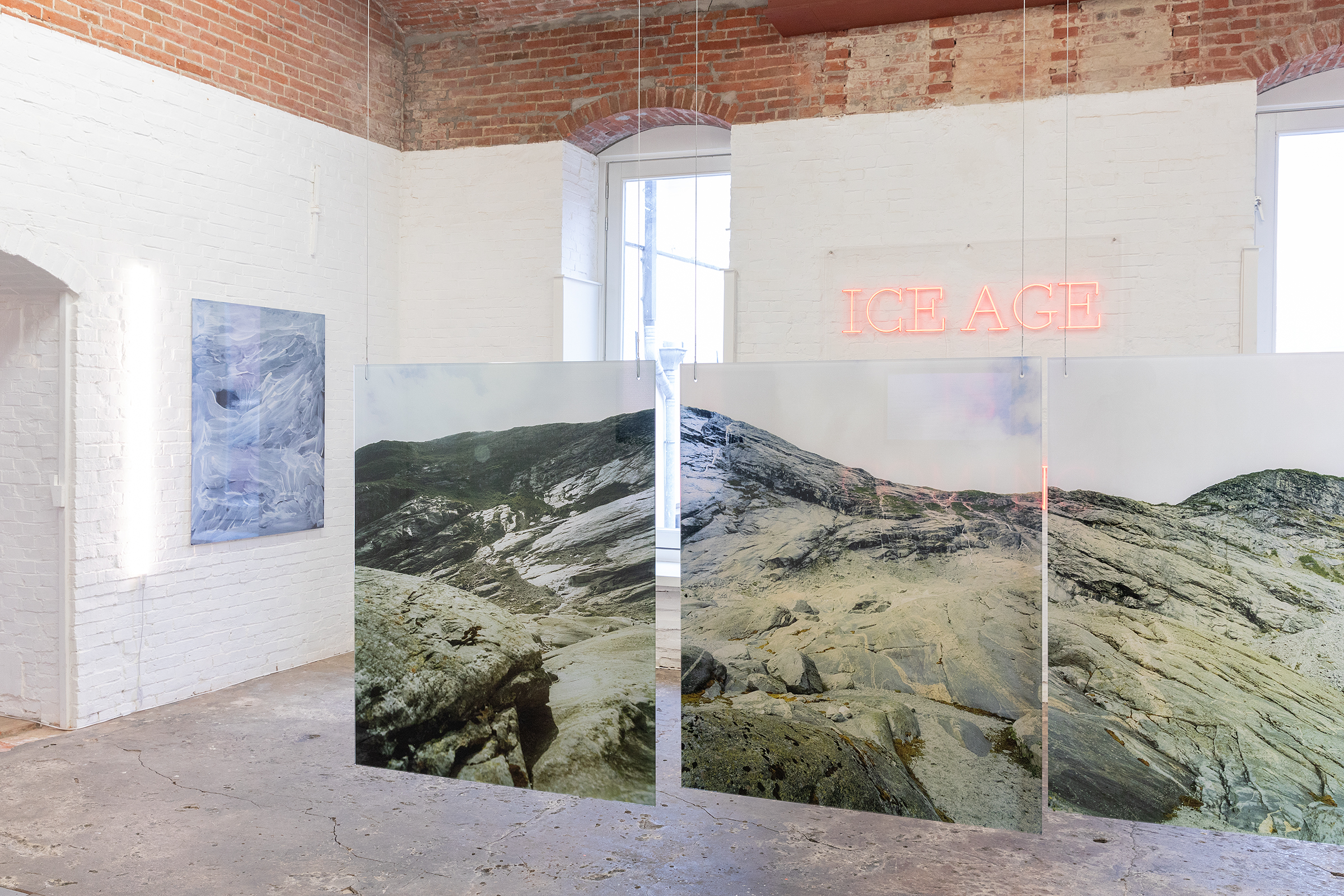 Deze foto’s heeft de kunstenaar in 2019 gemaakt tijdens een reis naar Noorwegen. Zij was al geïnteresseerd in noordelijke landschappen, maar dit was de eerste keer dat zij boven de poolcirkel kwam, wat een grote indruk op haar maakte. Gletsjer 6 is dus zowel een document van het verdwijnen van het ijs als een persoonlijk souvenir van een bijzondere ervaring, in een ongewone vorm. Meerluiken zijn in de middeleeuwen ontstaan om religieuze verhalen uitgebreid te kunnen vertellen, waarbij door de luiken te openen en te sluiten twee kanten konden worden getoond. Tegenwoordig functioneren meerluiken in profane contexten, maar zorgen nog altijd voor verheffing van wat af- of uitgebeeld wordt. Het vierluik bevindt zich dus het dichts bij de documentaire fotografie en verwijst tegelijkertijd naar een vorm van beeldende kunst waarin vroeger verhalen werden verteld. Voor Margriet is het thema van ICE AGE IS COMING zeer uitdagend, maar gaat gepaard met de verantwoordelijkheden die we allen hebben en die zij specifiek als kunstenaar heeft. Zij is zich ervan bewust dat zij met haar gedrag en werkzaamheden, zoals het reizen, fotograferen, filmen en het schilderen – met de daarbij behorende CO2 uitstoot, gebruik van elektriciteit en chemische middelen – bijdraagt aan de klimaatverandering en diens drastische gevolgen. De hierdoor opgeroepen schuldgevoel draagt zij altijd met zich mee. ICE AGE IS COMING is dan ook een gigantisch thema dat de komende tijd ons aller leven gaat bepalen. Kunnen we het tij nog keren of is de Apocalyps aanstaande? Op dit moment trachten zowel wetenschappers als activisten ons nadrukkelijk op onze precaire situatie te wijzen. Maar als kunstenaars dit doen, komt de boodschap op een andere manier over. Dan kunnen we in genuanceerde en doorleefde werken tegelijk de schoonheid en de verschrikking van de vernietiging ervaren en we zien ook de hoop opflikkeren die wij mensen nodig hebben om te kunnen blijven ademen.