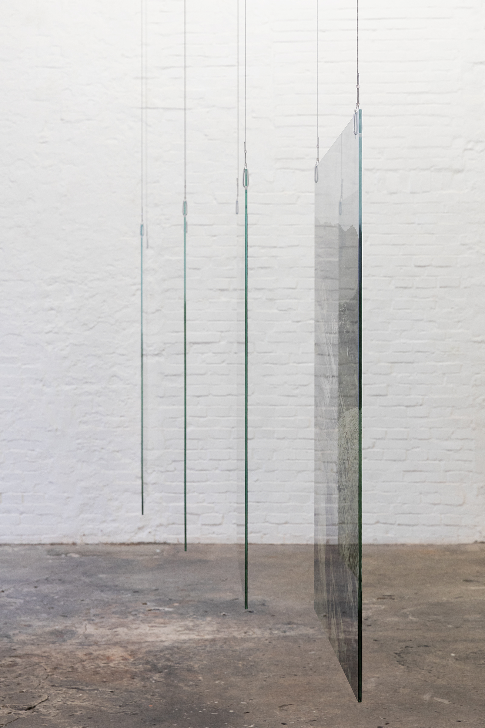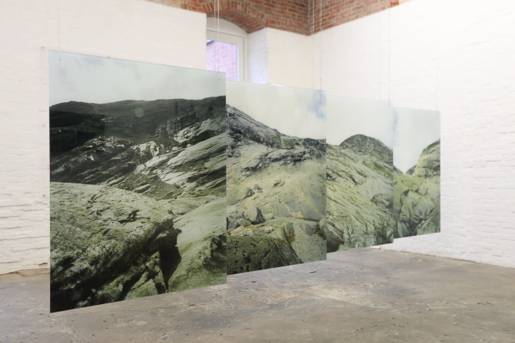 Tussen de werken Gletsjer 2 en 3 en de films Sailing Home 2 en 3 bevinden zich ter weerszijden van een hoek van de ruimte twee verticale werken Gletsjer 4 en 5 (120 x 164 cm per werk). In de hoek worden ze door een verticale tl-buis van elkaar gescheiden. Ze zijn een eerbetoon aan Louise Boyd en gaan een directe relatie aan met een zwart-wit foto die zij in 1931 van de Hisinger gletsjer in Oost-Groenland maakte. De penseelstreken volgen de plooien en schaduwen van de gefotografeerde ijsmassa. Het ene werk is lichter, het andere donkerder om de bewegingen van het ijs en de daardoor optredende veranderingen te thematiseren. De foto is echter zodanig overgeschilderd dat ze bijna door de werken van Margriet werd geabsorbeerd. Hiervoor was sprake van penseelstreken en van overschilderen, maar het schilderen maakt slechts een onderdeel uit van het werkproces van de kunstenaar. Bovenbeschreven werken bevinden zich tussen fotografie en schilderkunst in en zijn de meest persoonlijke onderdelen van de installatie. Margriet begint altijd met foto’s van de waarneembare werkelijkheid, van haarzelf of van anderen. Zij is geïnteresseerd in fotografische beelden, maar slechts zelden laat zij ze onbewerkt. In haar atelier scant ze de foto’s, print de scans uit en beschildert die met acrylverf. Technisch gezien veranderen de foto’s dan in schilderijen, toch is de transformatie nog niet voltooid. De beschilderde scans worden gefotografeerd, weer gescand en dan afgedrukt op glanzend fotopapier, waarna ze op een ondergrond van Aluminium Dibond gemonteerd worden. Dit is de werkwijze die bij Gletsjer 1 en bij Gletsjer 4 en 5 gevolgd is. Bij Margriet van Weenen vragen foto’s om verschillende bewerkingen en elk bewerkt beeld kan verder bewerkt worden om in een tentoonstelling of boek, anders te verschijnen. Al deze bewerkingen hebben met de verhouding van de kunstenaar tot de natuur en de kunst te maken. Zich in een landschap bevinden en op zee varen, zijn voor Margriet meditatieve ervaringen waarbij zij zich sterk met de natuur verbonden voelt. Dit probeert zij in haar foto’s en films weer te geven, wat soms wonderbaarlijk lukt, maar de foto’s vragen meestal om extra bewerkingen in het atelier. De flow van het maken, lijkt op de oorspronkelijke meditatieve ervaringen waarbij de kunstenaar de beelden zich letterlijk eigen maakt door ze van ‘merktekens’ – de penseelstreken – te voorzien. Zo komen fictieve beelden tot stand waarvan sommige de natuurlijke schoonheid van het gefotografeerde landschap accentueren en andere deze schoonheid juist vernietigen, opdat de werken zelfstandiger kunnen functioneren. Om dit laatste te benadrukken, gebruikt de kunstenaar tl-buizen waarbij het kunstlicht de kleuren verheldert, de texturen en vormen omfloerst, zodat het ‘kunst-karakter’ van sommige werken extra op de voorgrond treedt. De hier beschreven werkwijze lijkt nogal ingewikkeld tot we beseffen dat in het werk van Margriet twee beeldende categorieën bij elkaar komen. Haar aandacht voor de natuur en de ongerustheid over diens lot kan zij soms het beste in meer of minder documentaire foto’s en films weergeven. Andere keren wendt zij zich tot het fictieve karakter van kunst om haar ervaringen met de natuur door de vereniging van fotografie en schilder- of beeldhouwkunst te tonen. Haar werken refereren dus aan twee categorieën, maar raken zelden de uitersten. Meestal zijn ze vermengingen die, afhankelijk van wat zij wil weergeven, soms dichterbij een van categorieën komen. Het vierluik Gletsjer 6 (100 x 125 cm. per paneel), dat het centrum van de installatie vormt, is een vermenging die op het eerste gezicht direct bij de fotografie aansluit. De vier foto’s zijn op glas geprint, zodat de luiken van beide kanten te bekijken zijn. Samen tonen ze een golvend, grijs rotslandschap met schaarse begroeiing waarboven de witte wolken slechts kleine stukjes blauw toelaten. Dergelijke landschappen zijn karakteristiek voor noordelijke gebieden. Ze zijn veroorzaakt door gletsjers die wegsmolten – en nu in toenemende mate wegsmelten – zodat het afgeronde, door het ijs gepolijste gesteente zichtbaar wordt.