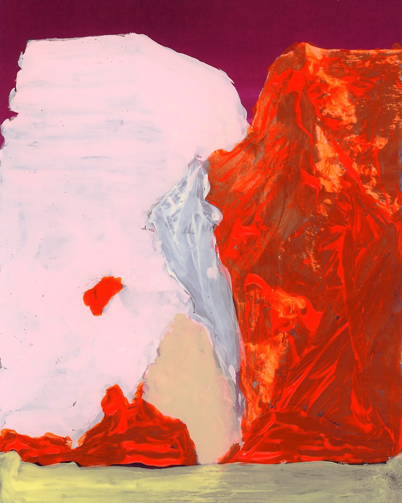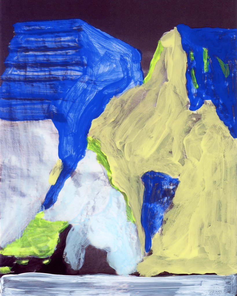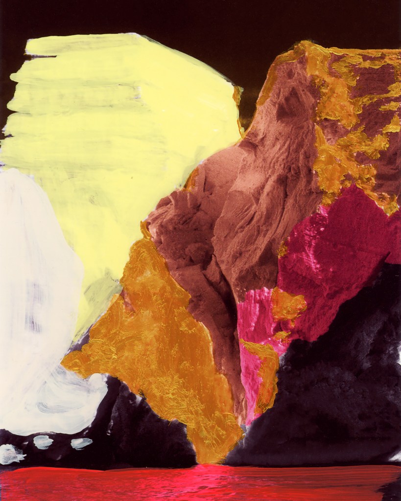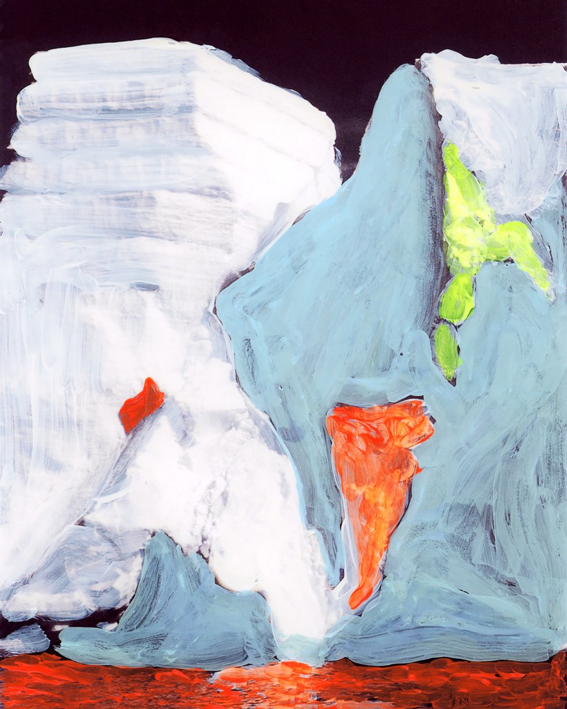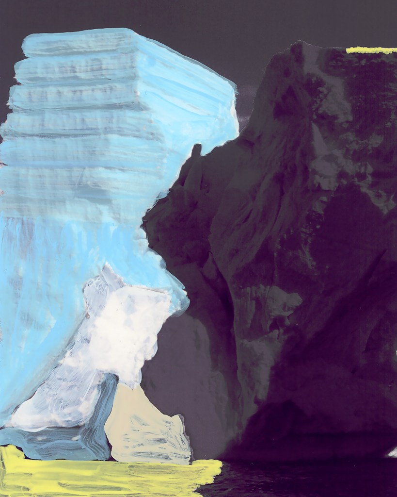 ICE BERG page 106 originated from a found photograph of an iceberg. The photo comes from the book The Planet Earth: Glaciers, published in 1983, the year I was born. In the early years, the “Ice Patrol” attempted to mark the most dangerous icebergs, but this proved to be an impossible task due to the constantly changing shapes of the icebergs. Until the mid-1960s, these markings were done with paint. This historical fact serves as the inspiration for the artwork ICE BERG page 106. The piece was created through a painterly process with a photographic finish.